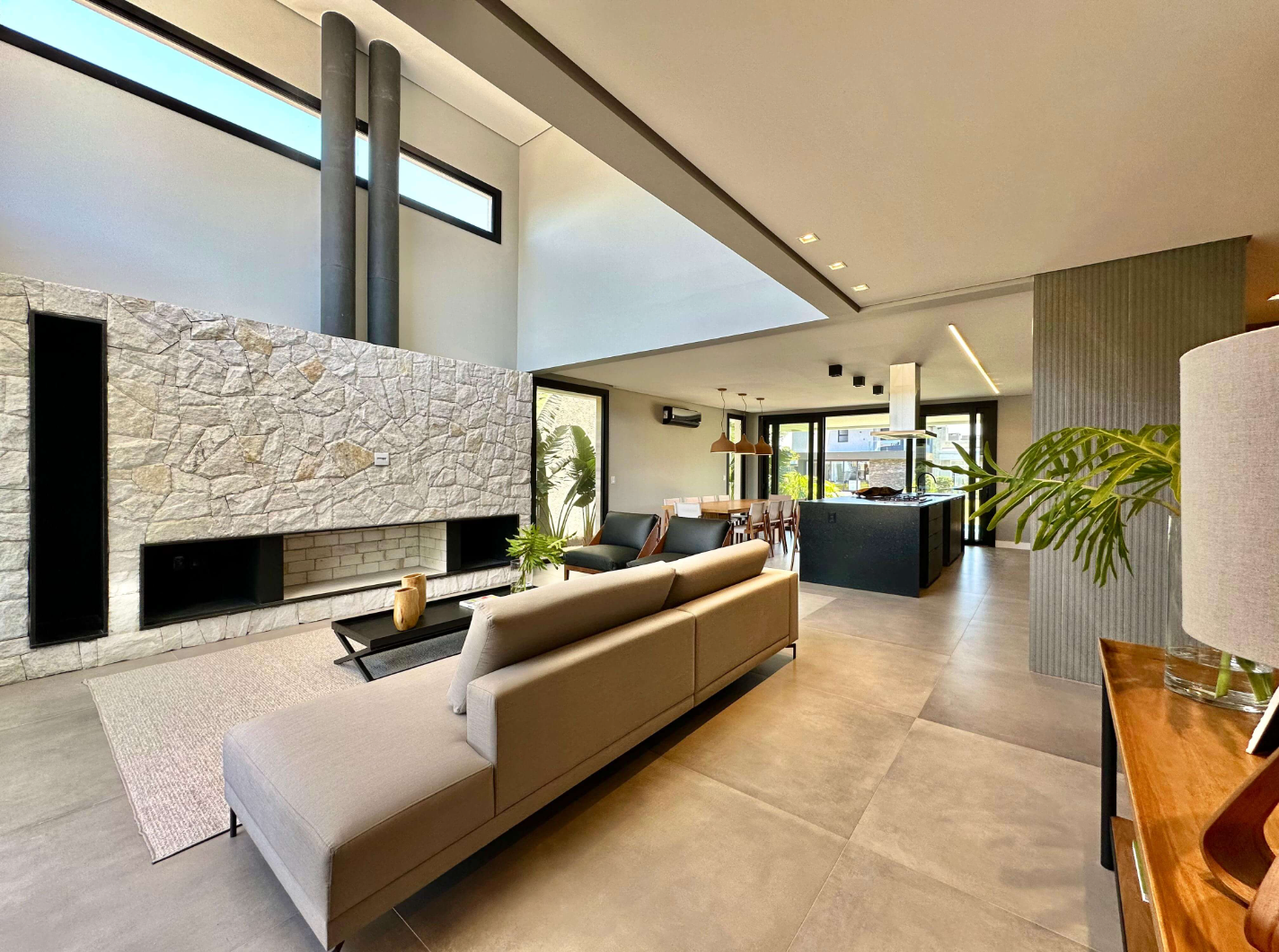 O amplo living, dividido em três ambientes, é o cenário perfeito para receber amigos ou desfrutar momentos em família, aquecido pelo charme de uma lareira sofisticada. A cozinha integrada conecta-se harmoniosamente ao espaço gourmet com churrasqueira, proporcionando um ambiente funcional e encantador.