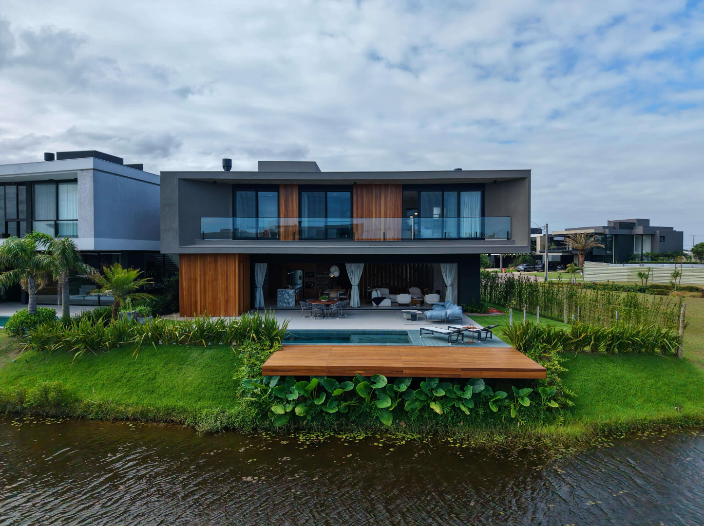Do lado de fora, a piscina de concreto (com espera para aquecimento) e o deck junto ao lago convidam você a relaxar e desfrutar de momentos inesquecíveis.